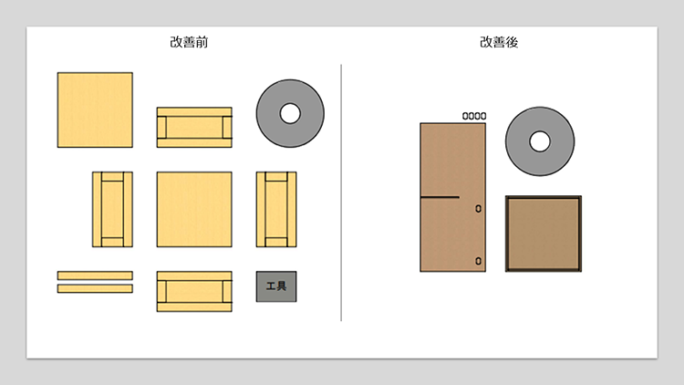 木箱梱包は、腰下・側・褄・蓋・製品押さえ・工具など多数の部品を使用していましたが、段ボール梱包は、スキッド一体型ヤッコ・蓋・Pジョイント4個と、部品数が減少しました。