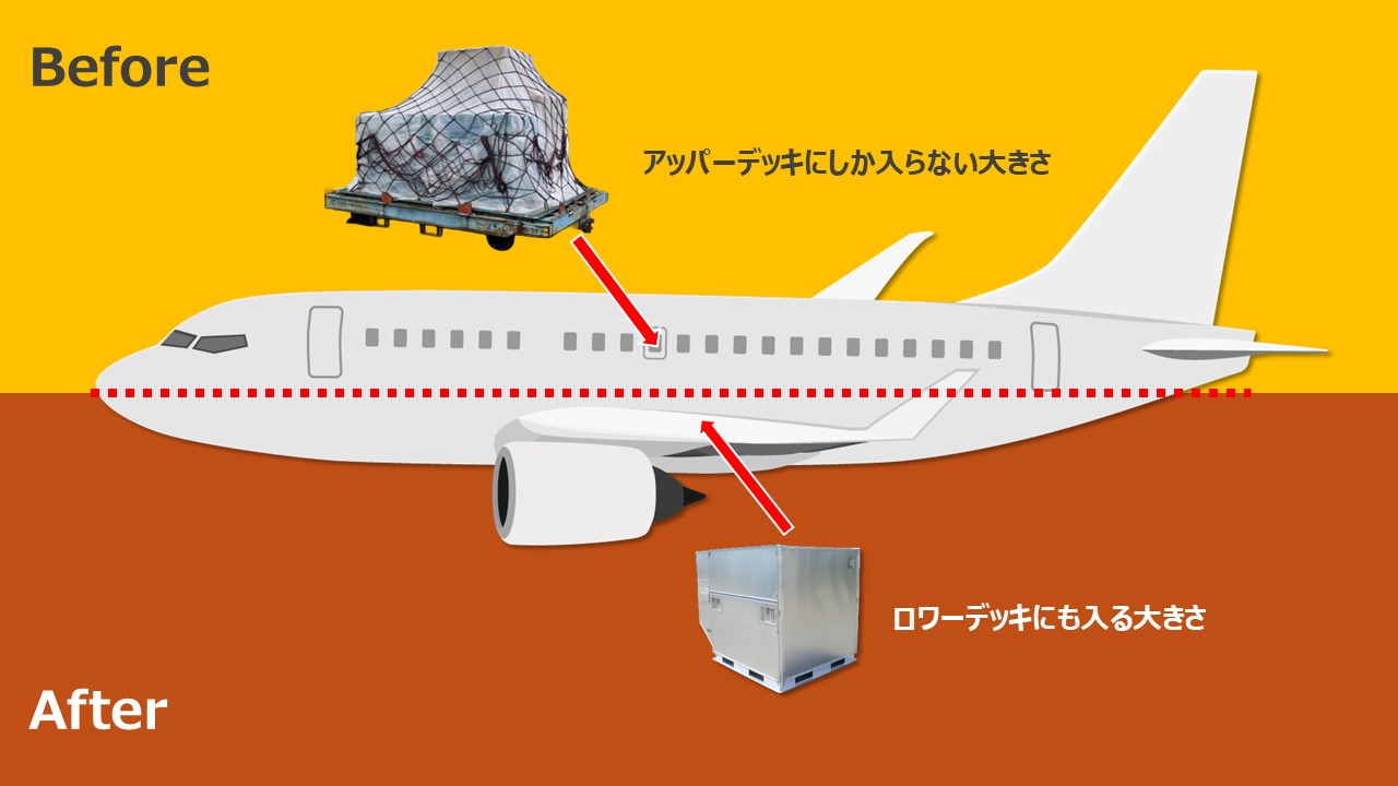 さらに、高さを150cm以下にすることで、旅客便のロワーデッキが利用できるようになり、便の手配がしやすくなったことや、輸送コストの削減につながりました。