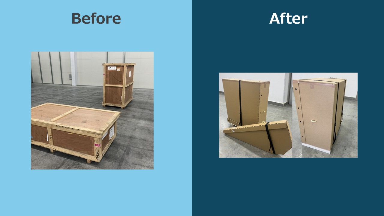 ・木箱梱包から強化段ボール梱包に変更したことで、梱包容器重量は80%削減され、環境負荷の低減に影響を及ぼしました。