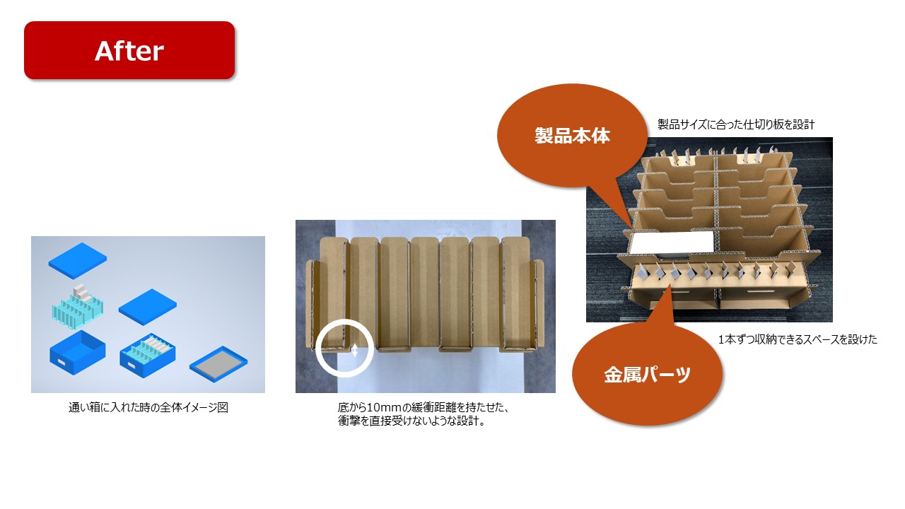 ・簡易的な仕切り板は製品サイズに合っておらず、箱の中で製品が安定しないため、ガタガタ動いていた